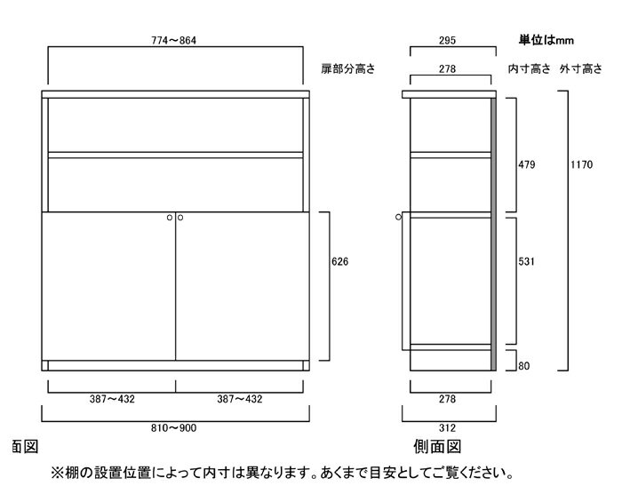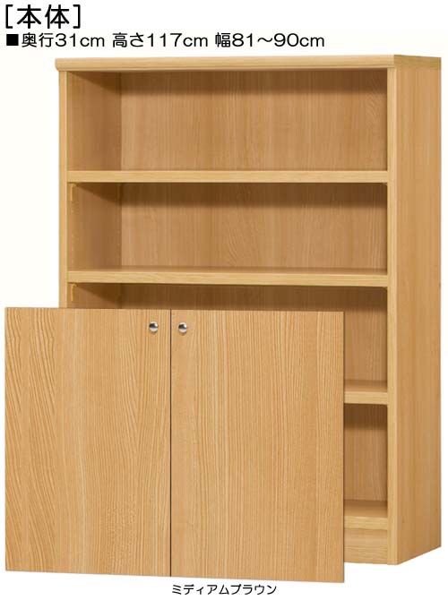 商品仕様 ■タイプ: 扉付 タフ棚板(棚板厚さ2.5cm)タイプ 両開き ■棚板耐荷重: 15kg ■外寸: 奥行31cm×高さ117cm×幅81〜90cm (幅は1cm単位でオーダーできます) ■外寸(幅): 81cm 82cm 83cm 84cm 84cm 85cm 86cm 87cm 89cm 90cm ■扉高(実寸): 62.6cm ■棚板枚数 移動固定棚板:3 共通仕様 ■材質: プリント化粧繊維板 ■塗装: ウレタン樹脂塗装 ■素材: ホルムアルデヒドの発生を最小限に抑えた基材・芯材・プリント紙・接着剤(F☆