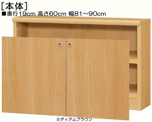 商品仕様 ■タイプ: 扉付 タフ棚板(棚板厚さ2.5cm)タイプ 両開き ■棚板耐荷重: 7Kg ■外寸: 奥行19cm×高さ60cm×幅81〜90cm (幅は1cm単位でオーダーできます) ■外寸(幅): 81cm 82cm 83cm 84cm 84cm 85cm 86cm 87cm 89cm 90cm ■棚板枚数 移動固定棚板:1 共通仕様 ■材質: プリント化粧繊維板 ■塗装: ウレタン樹脂塗装 ■素材: ホルムアルデヒドの発生を最小限に抑えた基材・芯材・プリント紙・接着剤(F☆