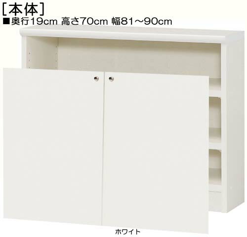 商品仕様 ■タイプ: 扉付 タフ棚板(棚板厚さ2.5cm)タイプ 両開き ■棚板耐荷重: 7Kg ■外寸: 奥行19cm×高さ70cm×幅81〜90cm (幅は1cm単位でオーダーできます) ■外寸(幅): 81cm 82cm 83cm 84cm 84cm 85cm 86cm 87cm 89cm 90cm ■棚板枚数 移動固定棚板:2 共通仕様 ■材質: プリント化粧繊維板 ■塗装: ウレタン樹脂塗装 ■素材: ホルムアルデヒドの発生を最小限に抑えた基材・芯材・プリント紙・接着剤(F☆