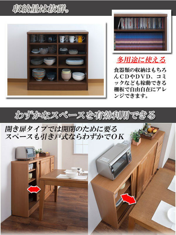 ■商品の仕様前板:天然木アルダー材(ウレタン樹脂塗装)、その他:プリント紙化粧繊維板●可動棚6枚(6cmピッチ・8段階)●耐荷重量/棚板:約5kg●商品重量:約23kg●日本製●完成品■商品サイズ本体:(約)幅90×奥行31×高さ88cm引戸内内寸 :(約)幅(左右各)42×奥行23×高さ69cm■梱包サイズ94×34×92(cm) 1個口■配送について●こちらの商品は配送日時の指定ができかねます。